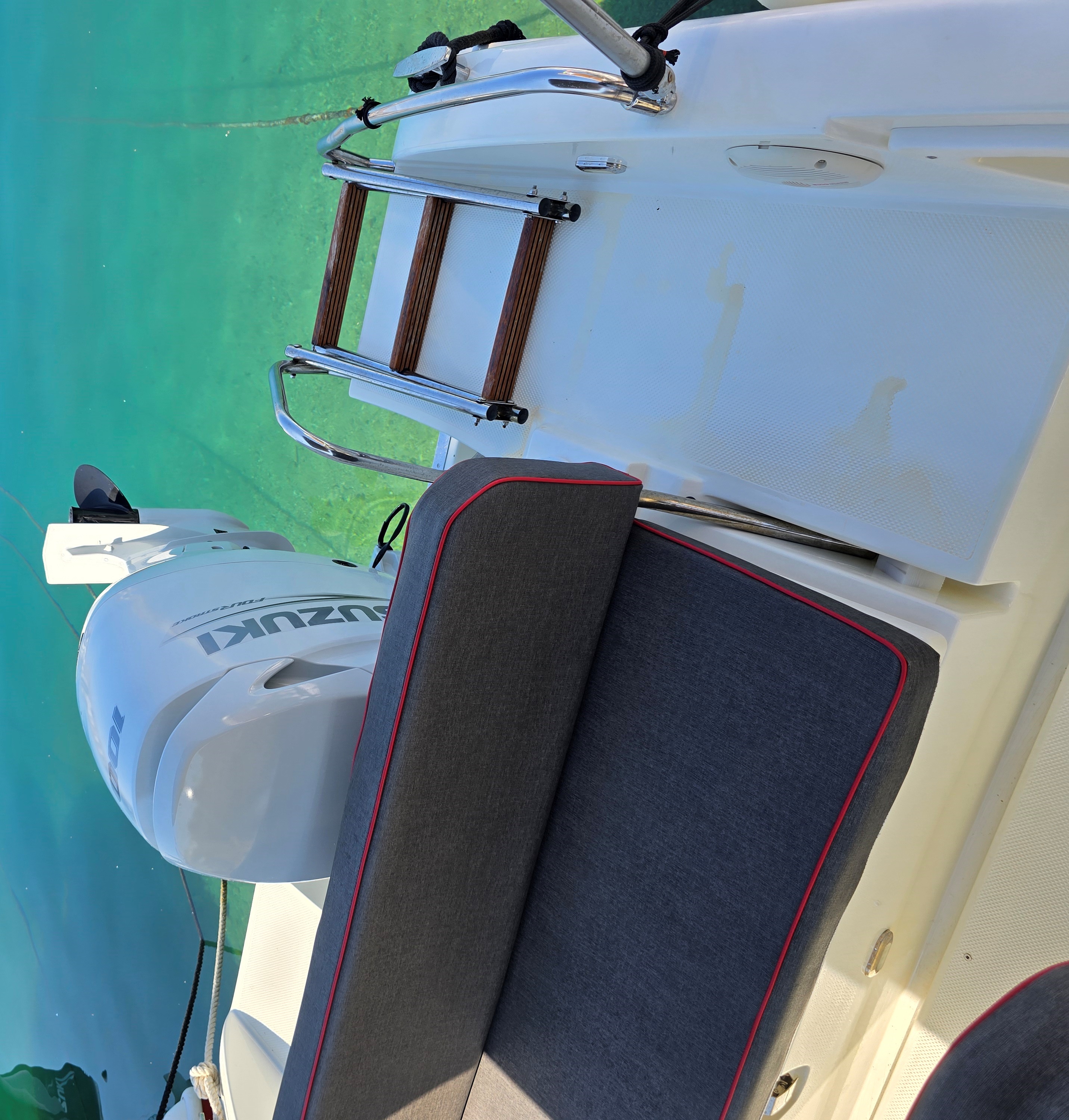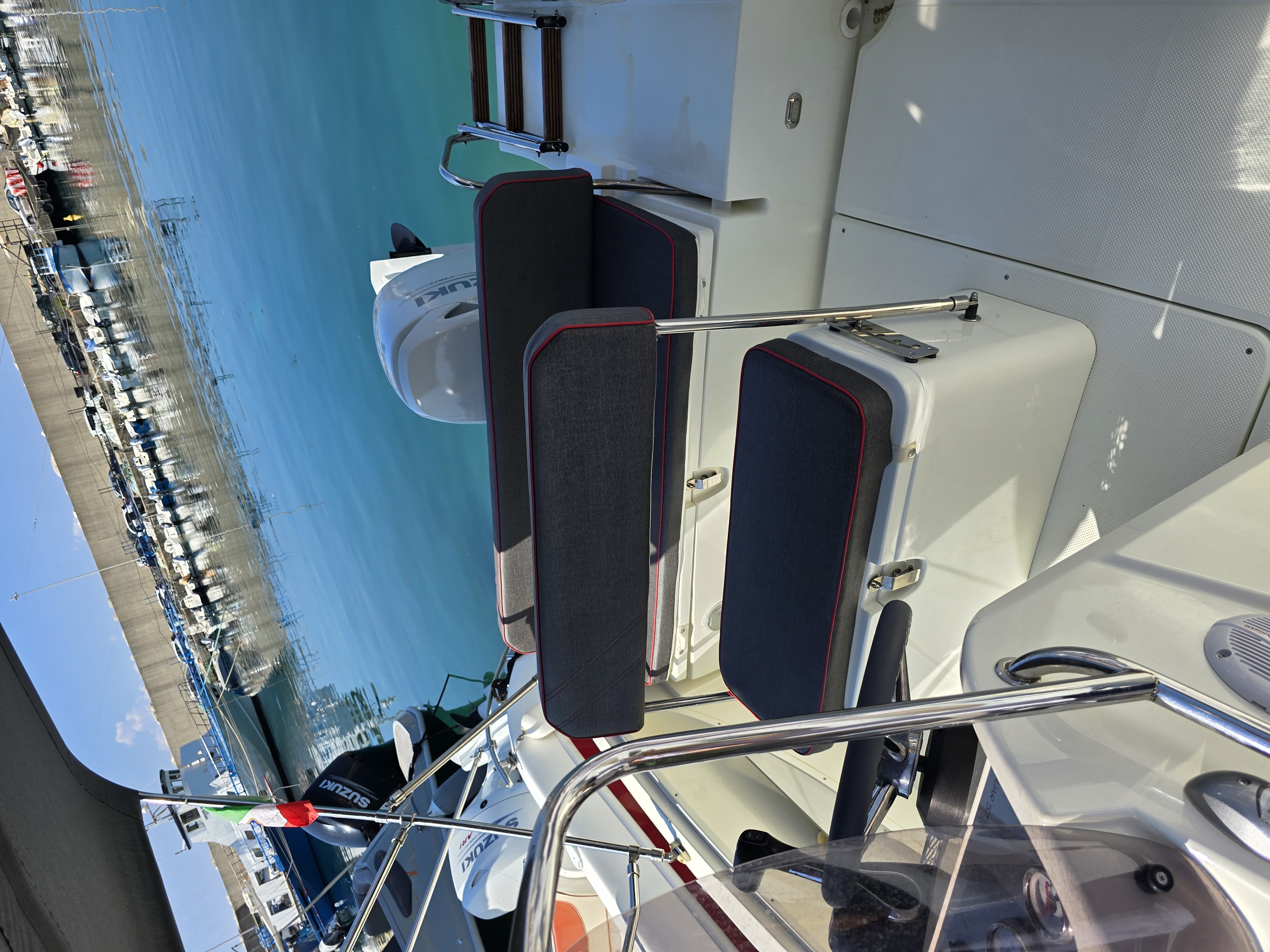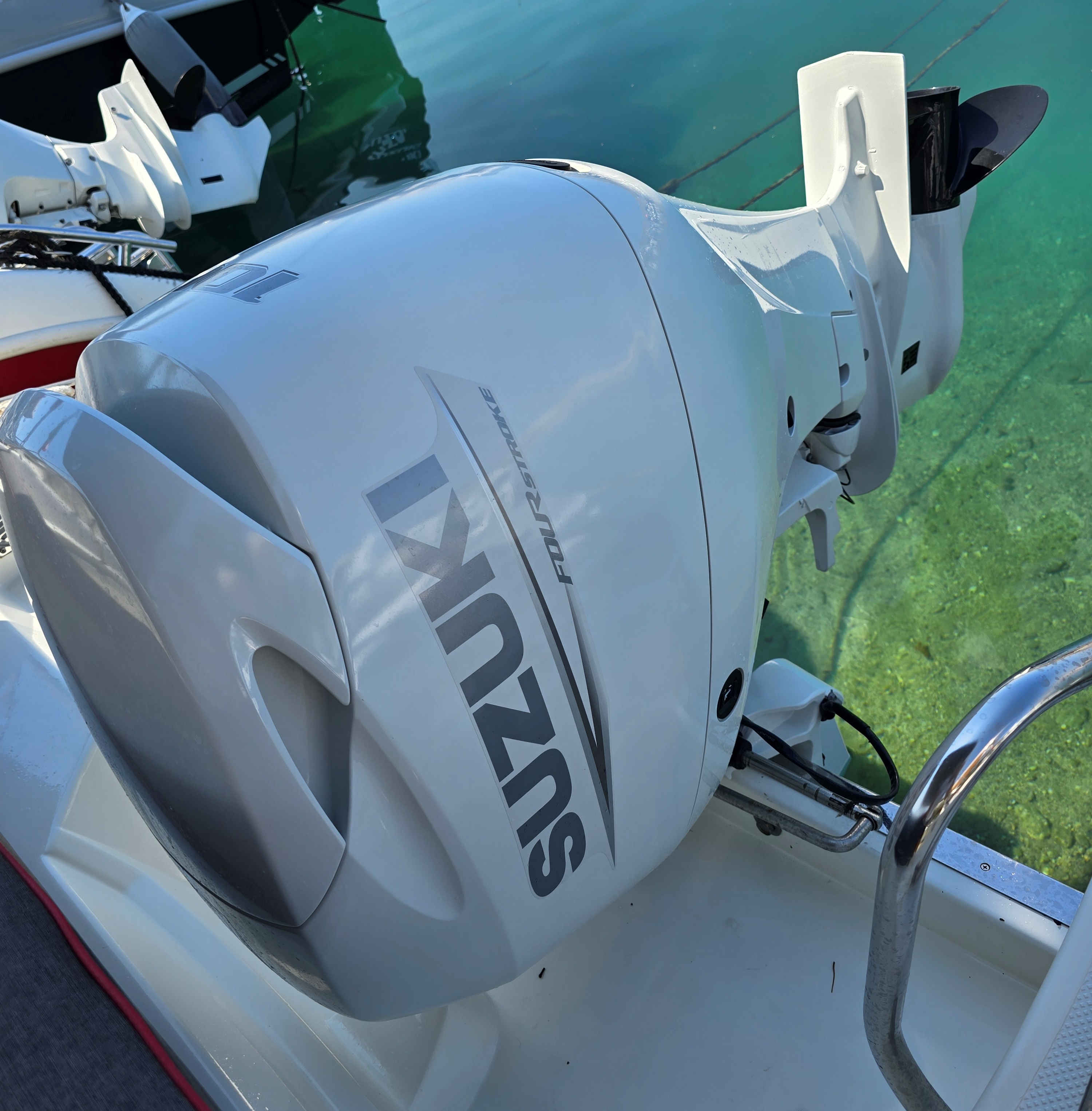 La barca è motorizzata con Fuoribordo Suzuki 100 HP 4 Tempi bianco, 34 nodi e consumi bassissimi,