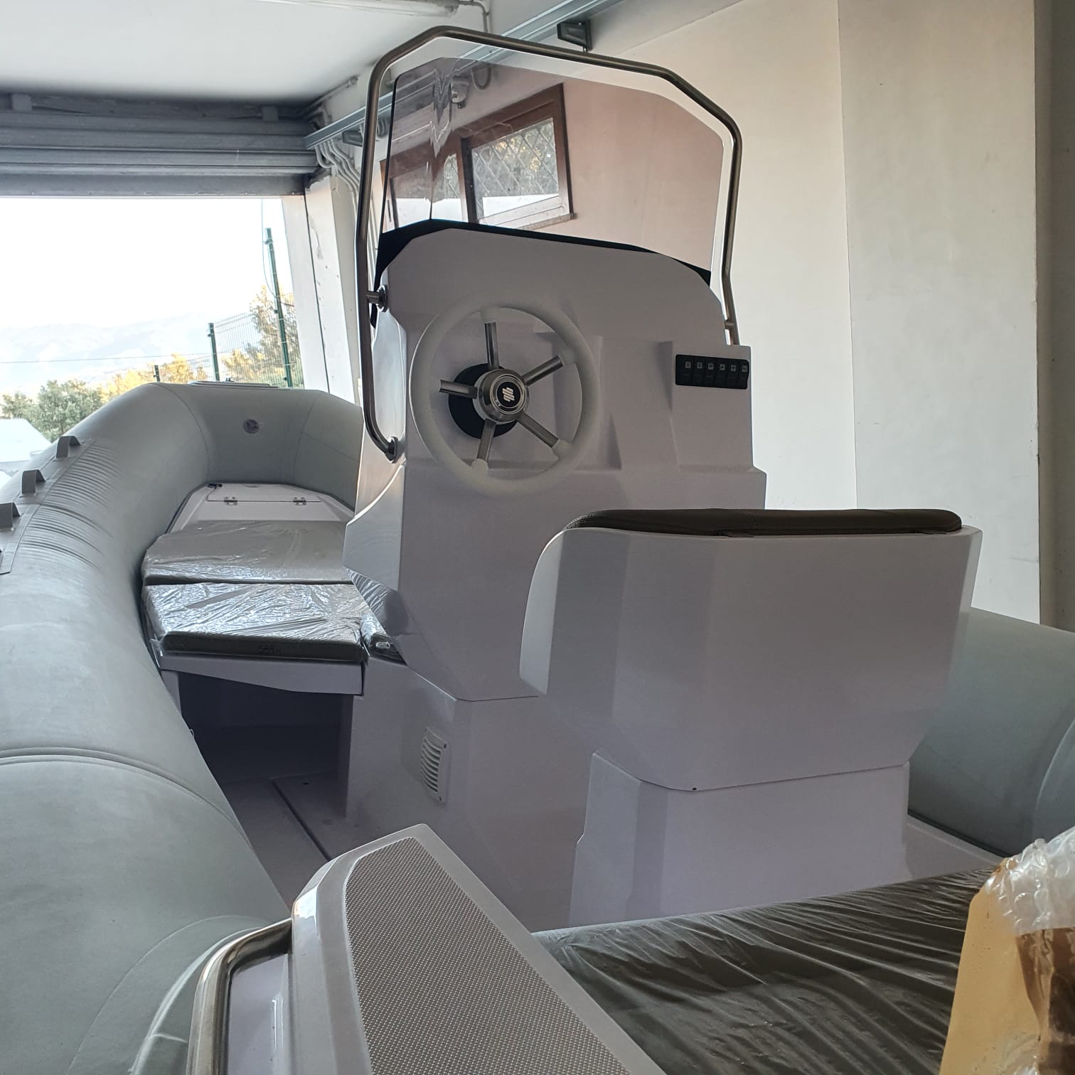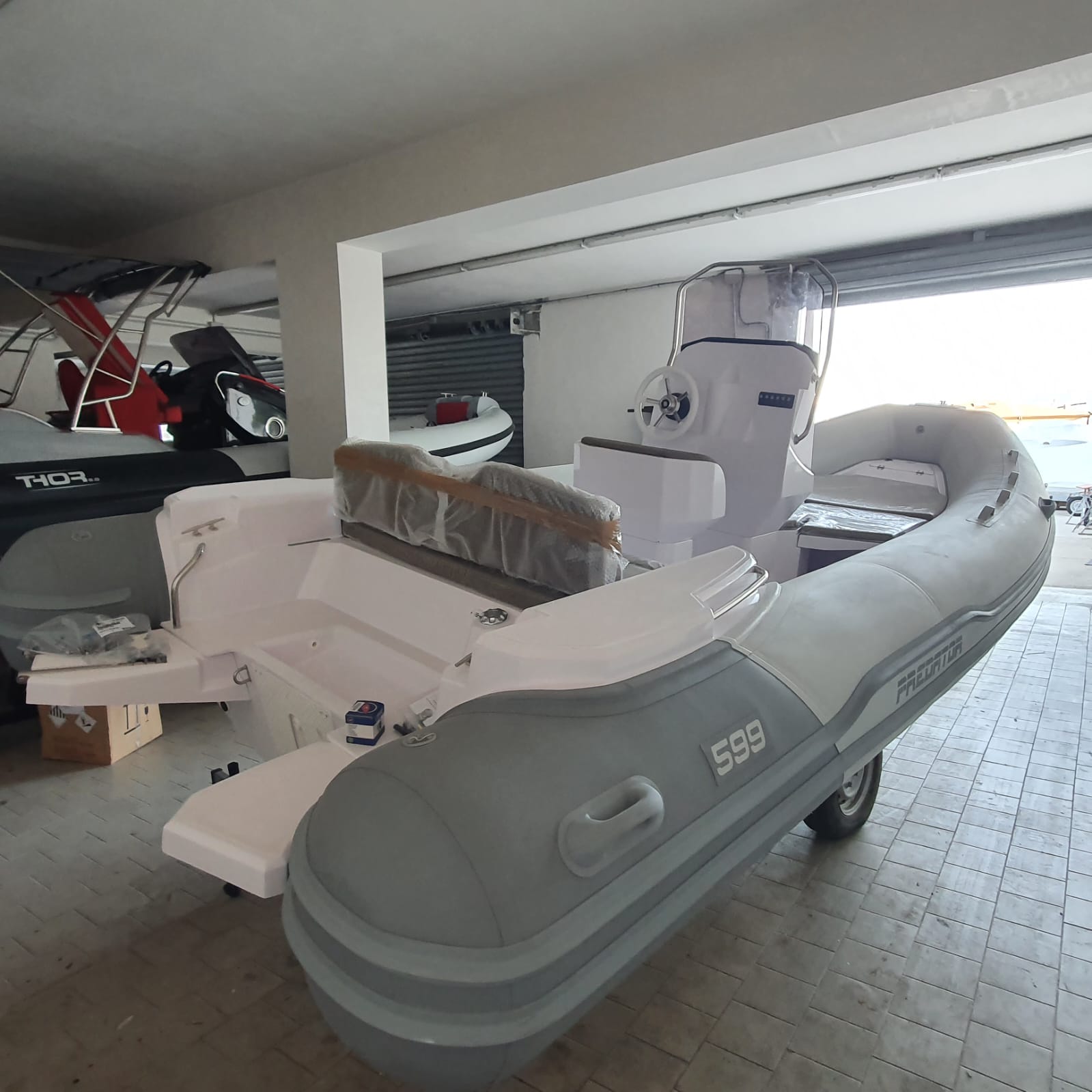 Gommone open marca Italboats modello 599 TS da 6 MT con tappezzeria color Silvertex Taupe e tubolari NEPTUNE GREY (poppa) e ARTIC GREY (prua)